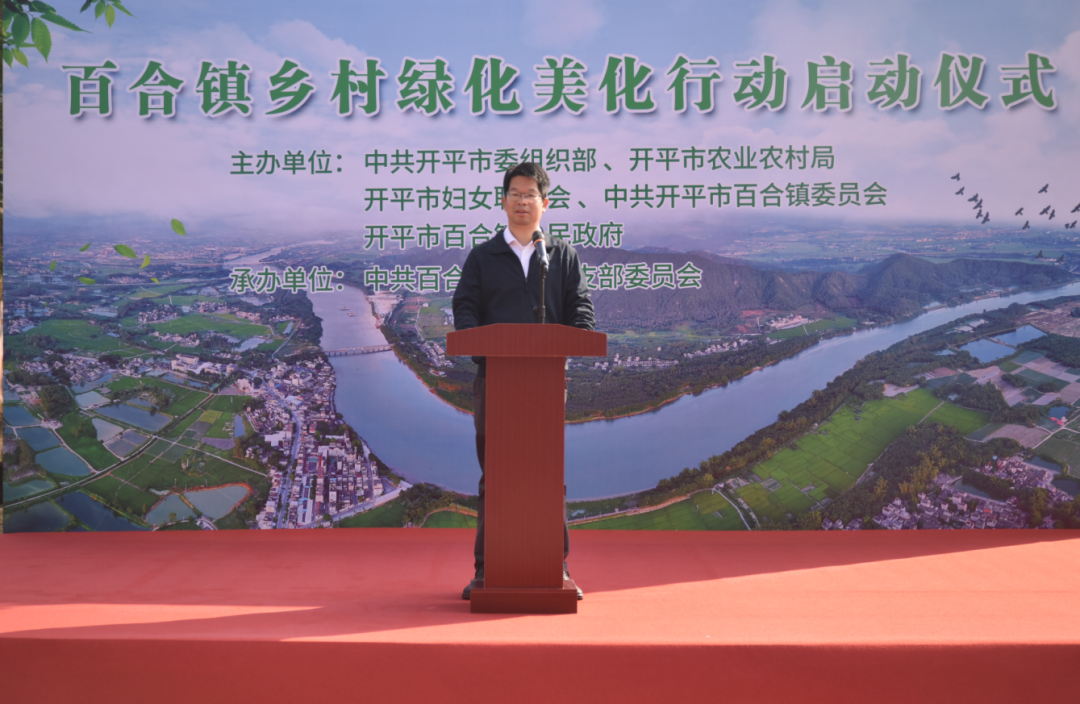 百合鎮黨委書記梁志偉向活動致辭。他表示,百合鎮要以培育省“百縣千鎮萬村高質量發展工程”典型鎮為重點,全面實施黨建引領“美麗庭院”建設和鄉村綠化美化行動,大力提升鄉村顏值和內涵;同時,助力開平市整縣推進農文旅融合發展試點的重要任務,依托潭江碧道、優美田園、碉樓村落等資源稟賦,量身定制“一村一民宿”招商規劃,將百合景點穿珠成鏈,推動農文旅融合高質量發展;此外,重視發動熱心鄉賢、僑胞、企業等社會力量,投身美麗鄉村建設,以家庭“小美”匯聚成鄉村“大美”。