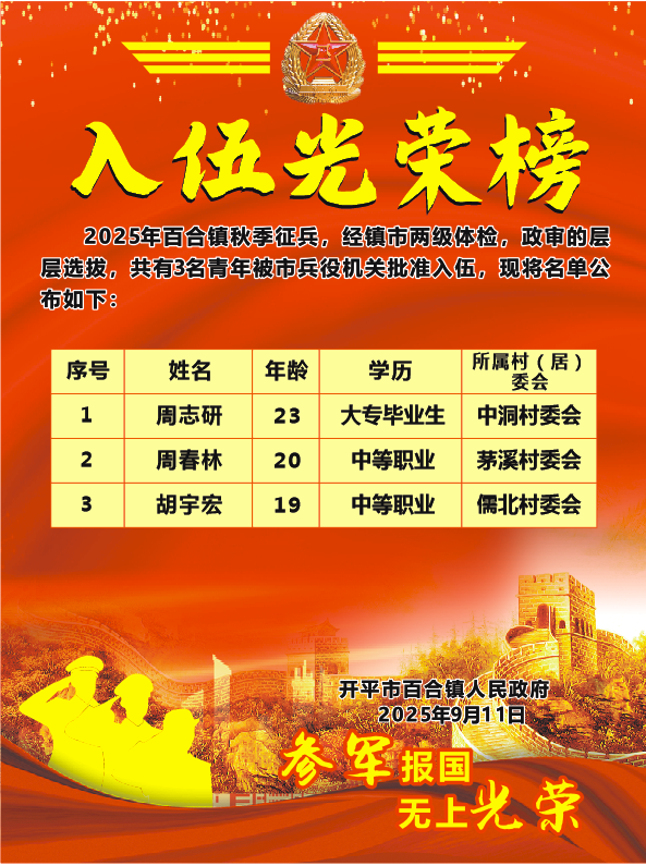 2025年秋季征兵工作開展以來,百合鎮廣大適齡青年積極響應祖國號召,踴躍報名參軍,經過嚴格挑選、層層把關,共有3名優秀青年被批準入伍,將分批啟程奔赴軍營。