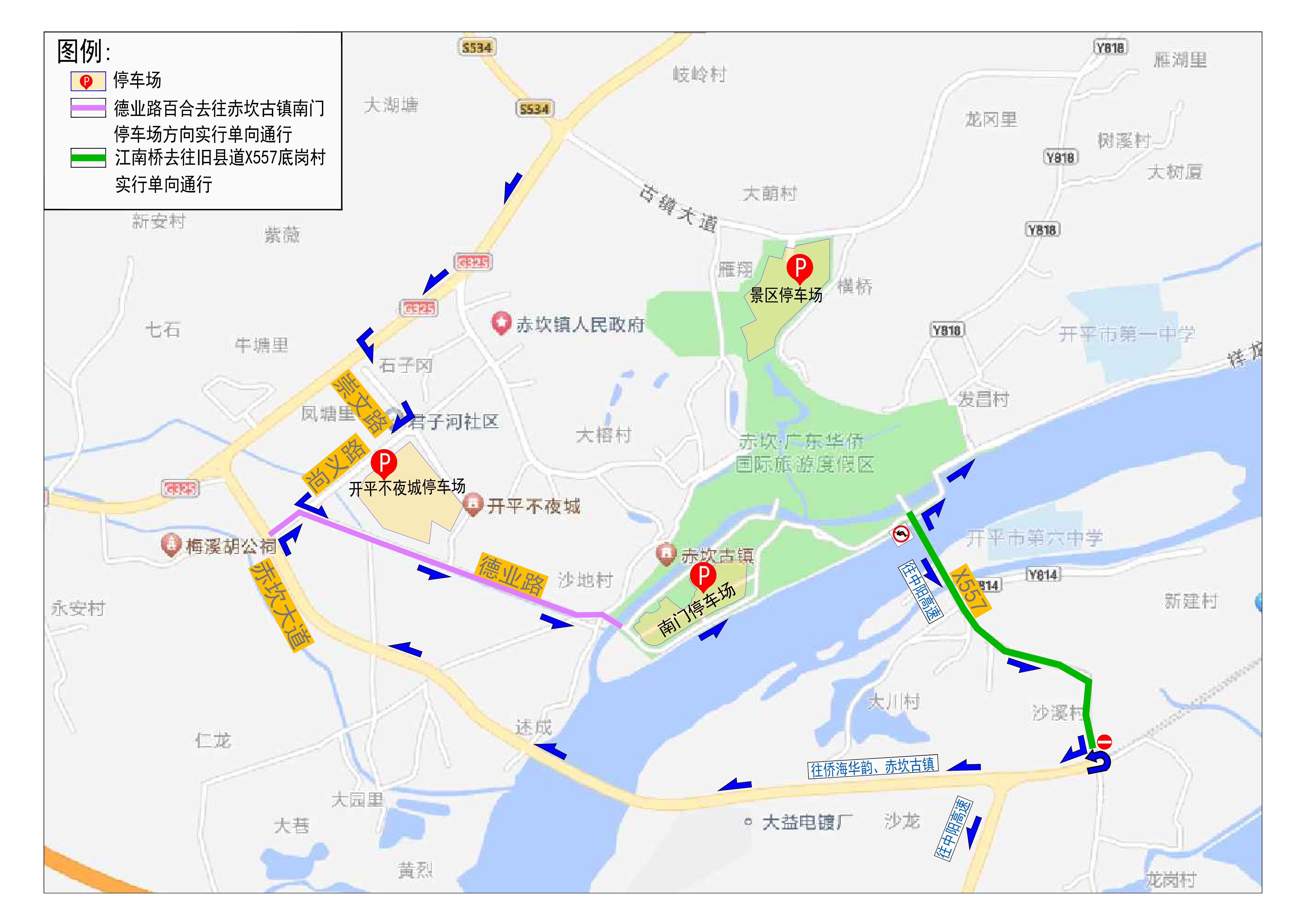 3.市區去往開平不夜城、古鎮南門停車場、赤坎鎮江南方向的車輛可由 G325國道轉入崇文路,經尚義路、德業路前往。
