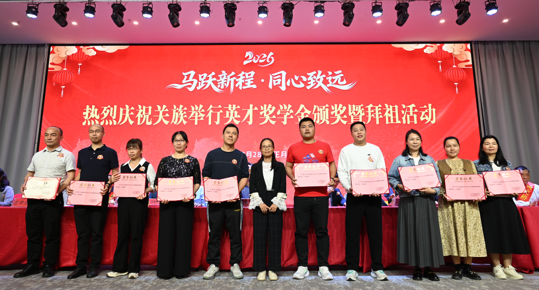 關英才是旅居文萊的著名愛國僑領、實業家,一生情系桑梓、熱心公益,1997年在關族圖書館設立關英才文化教育基金會,每年堅持開展頒獎活動,為激發關氏學子勤學奮進、營造尊師重教氛圍作出卓越貢獻。活動現場,與會領導、宗親代表為11名教師頒發2025年度關氏老師教育貢獻獎,為2025年開平市高考前三名的學生頒發獎學金,為2025年開平市高考劉氏、張氏、趙氏最高分各一名學生頒發獎學金,為2025年開平市關氏高考前10名、中考前10名的優秀學子頒發獎學金,頒發2026年第十三屆關氏藝術獎。