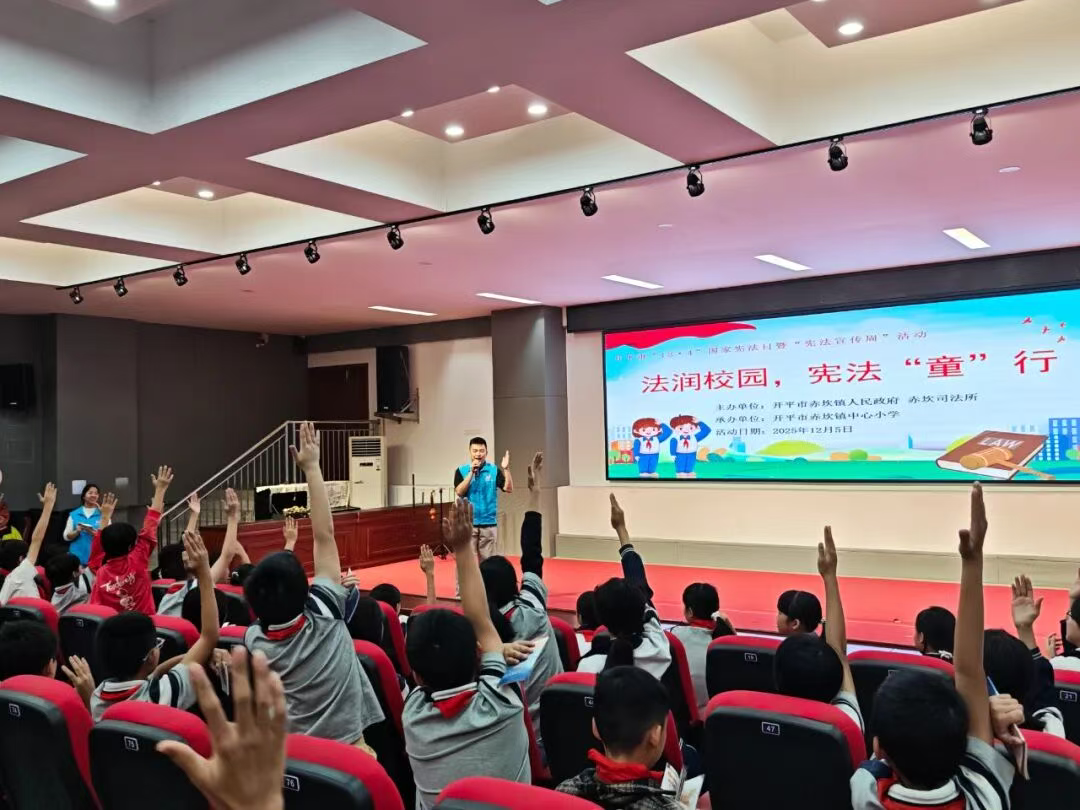 12月5日下午,普法接力棒傳至赤坎鎮中心小學。工作人員為學生們帶來了一堂生動的憲法啟蒙課,采取講故事、互動問答等形式,深入淺出地講解憲法知識,同學們踴躍發言,積極思考,在輕松愉快的氛圍中學法知法。