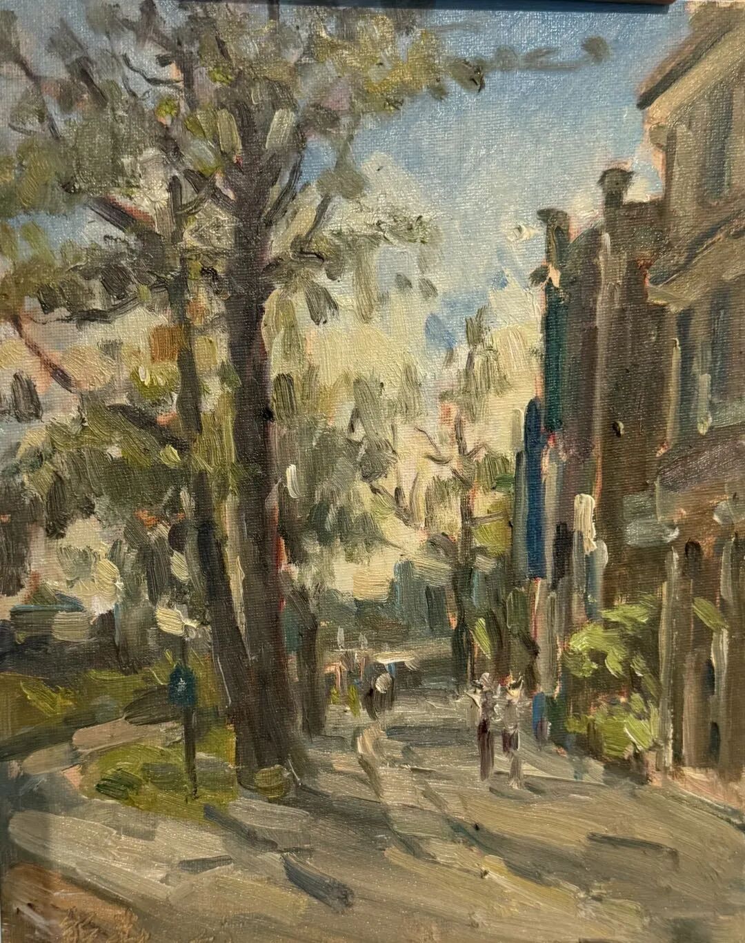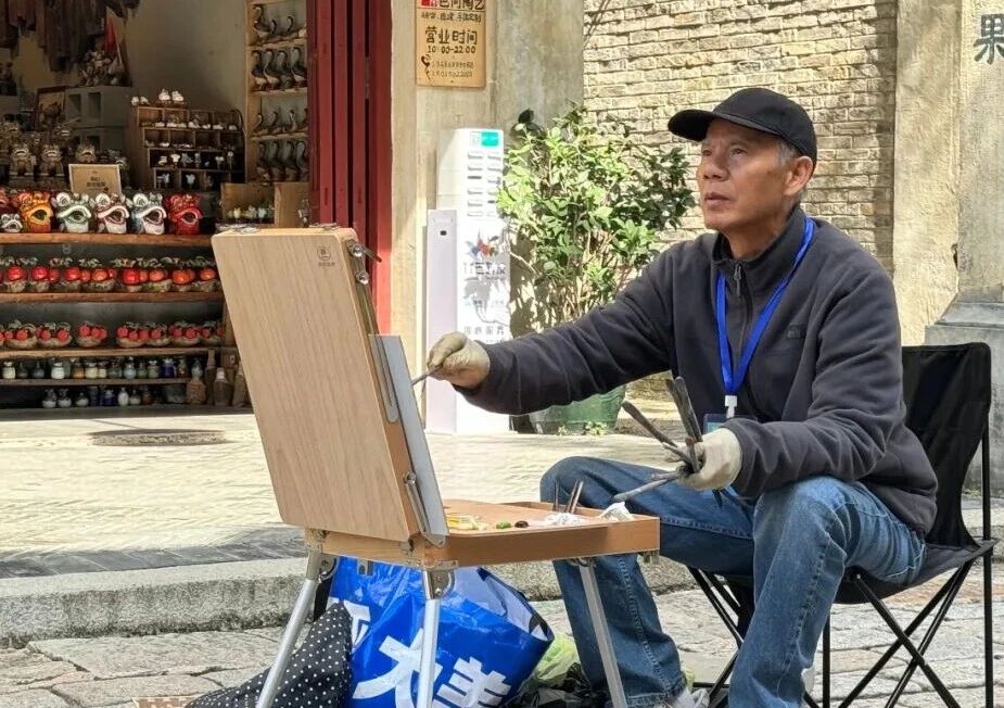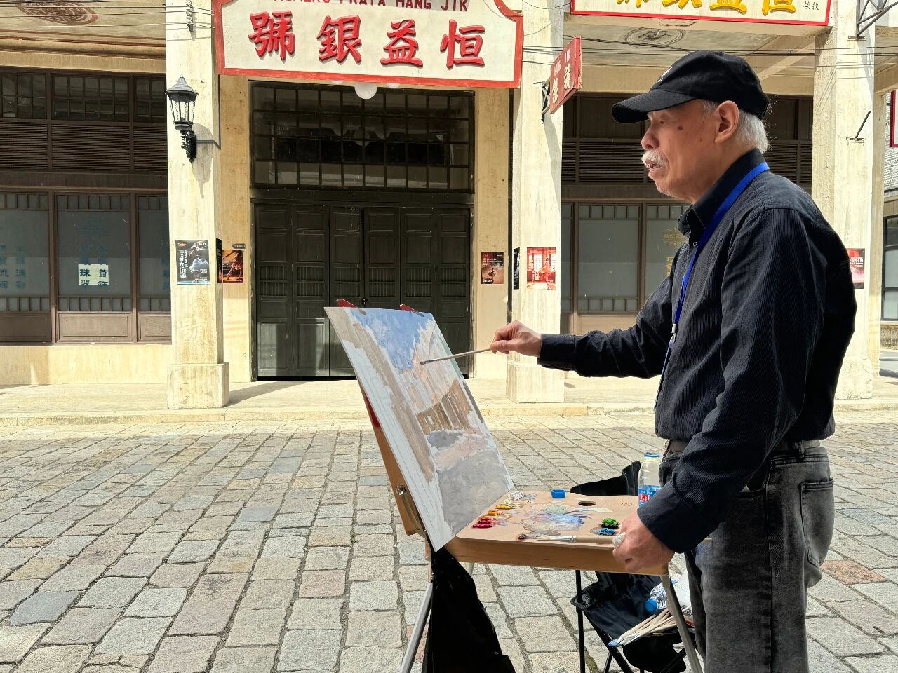 美國油畫家協(xié)會(huì)大師級(jí)會(huì)員司徒維能凝神觀照,揮筆繪寫古鎮(zhèn)晨間街道的鮮活景致。