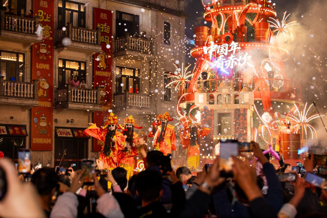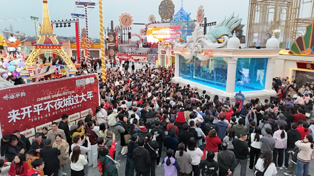 夢回開平·僑海華韻(開平不夜城)人氣火爆。熒光國潮賀歲、新春音樂會、煙花秀等活動日均百場、日夜不停,成為市民游客夜游打卡的熱門選擇。