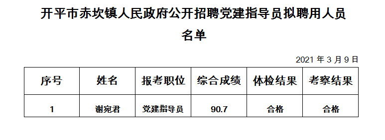 2021年開平市赤坎鎮人民政府公開招聘黨建指導員考試中,經考試、體檢和考察等程序,謝宛君同志符合所報崗位的資格條件,擬同意聘用,現予以公示。公示期間,如對擬聘用人員名單有異議,請以書面形式向我們反映并注明聯系方式(無聯系方式的恕不受理)。