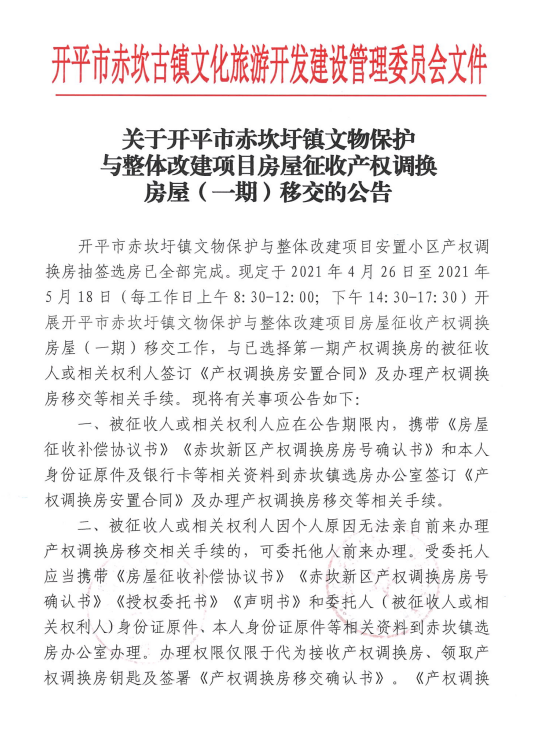 關于開平市赤坎圩鎮文物保護與整體改建項目房屋征收產權調換房屋(一期)移交的公告