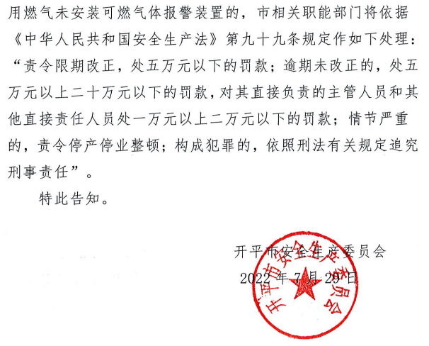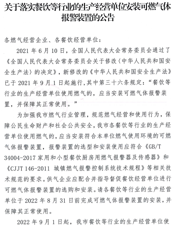 關(guān)于落實餐飲等行業(yè)的生產(chǎn)經(jīng)營單位安裝可燃氣體報警裝置的公告