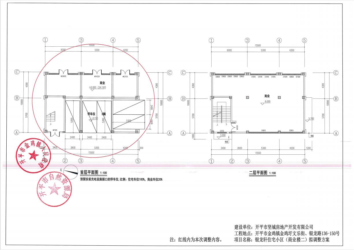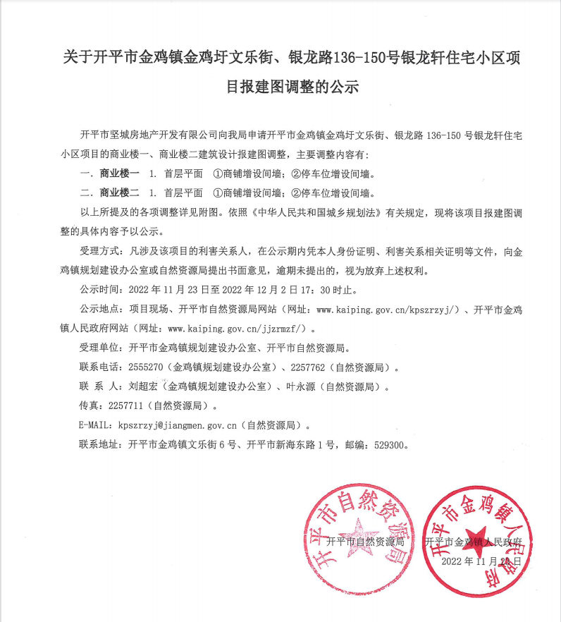 關于開平市金雞鎮金雞圩文樂街、銀龍路136-150號銀龍軒住宅小區項目報建圖調整的公示
