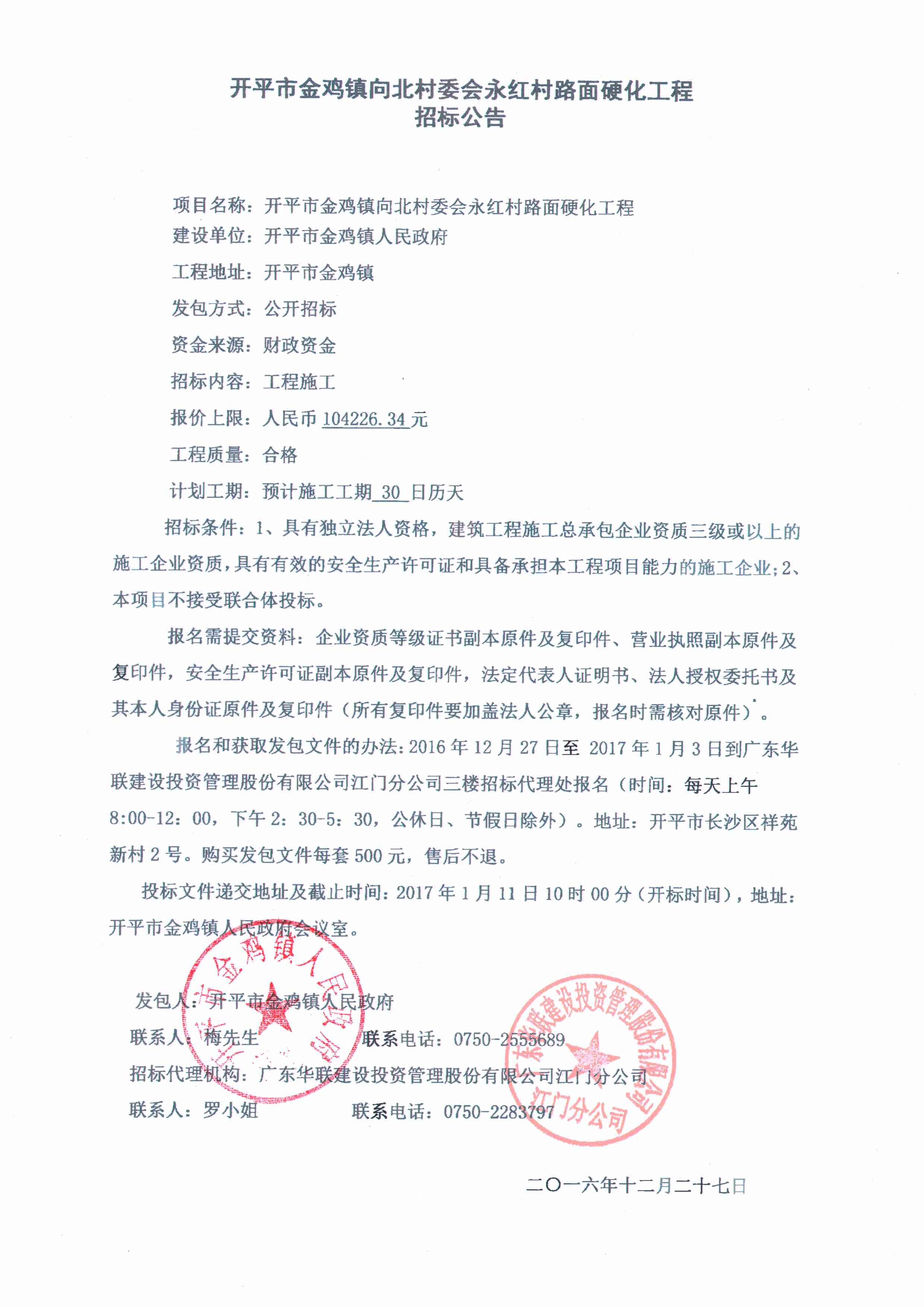 開平市金雞鎮向北村委會永紅村路面硬化工程招標公告