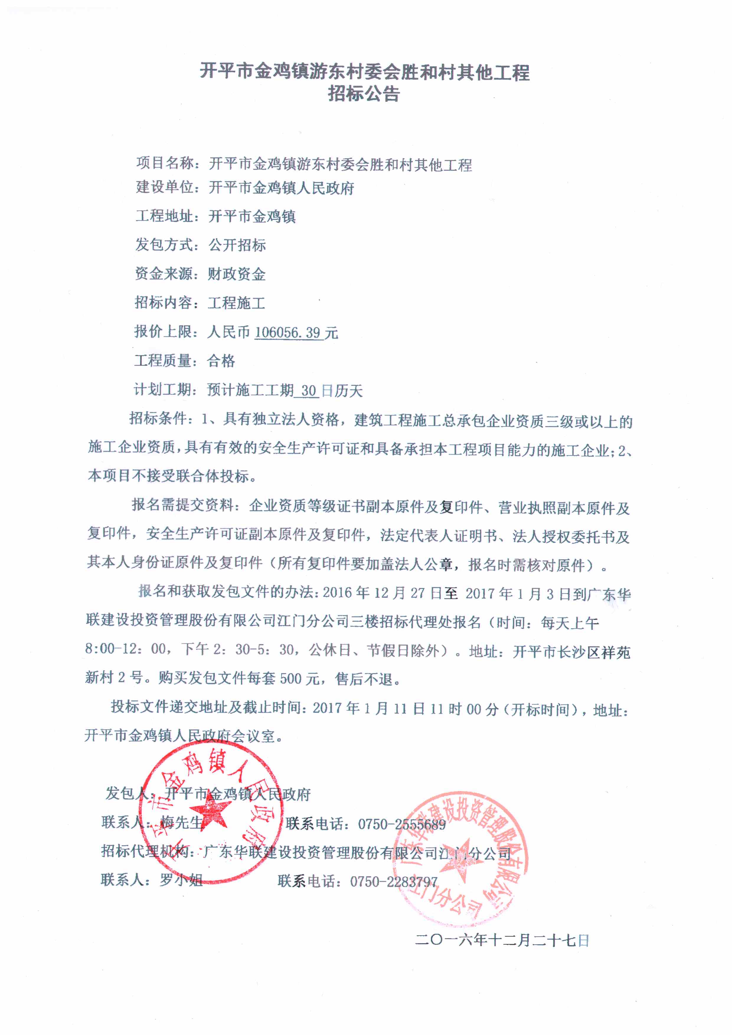 開平市金雞鎮游東村委會勝和村其它工程招標公告