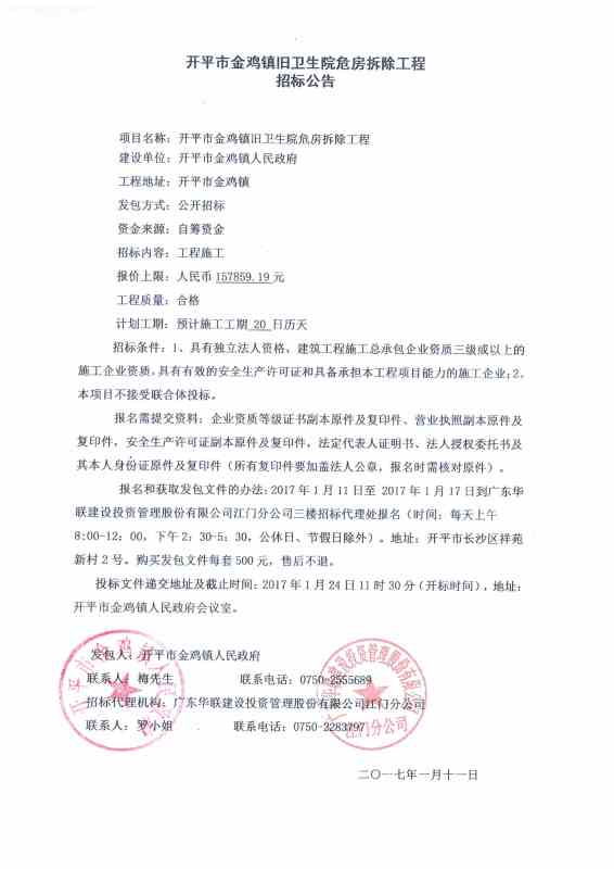 開平市金雞鎮舊衛生院危房拆除工程招標公告