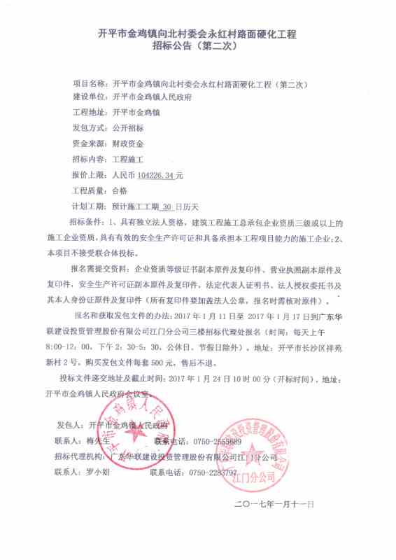 開平市金雞鎮向北村委會永紅村路面硬化工程(第二次)