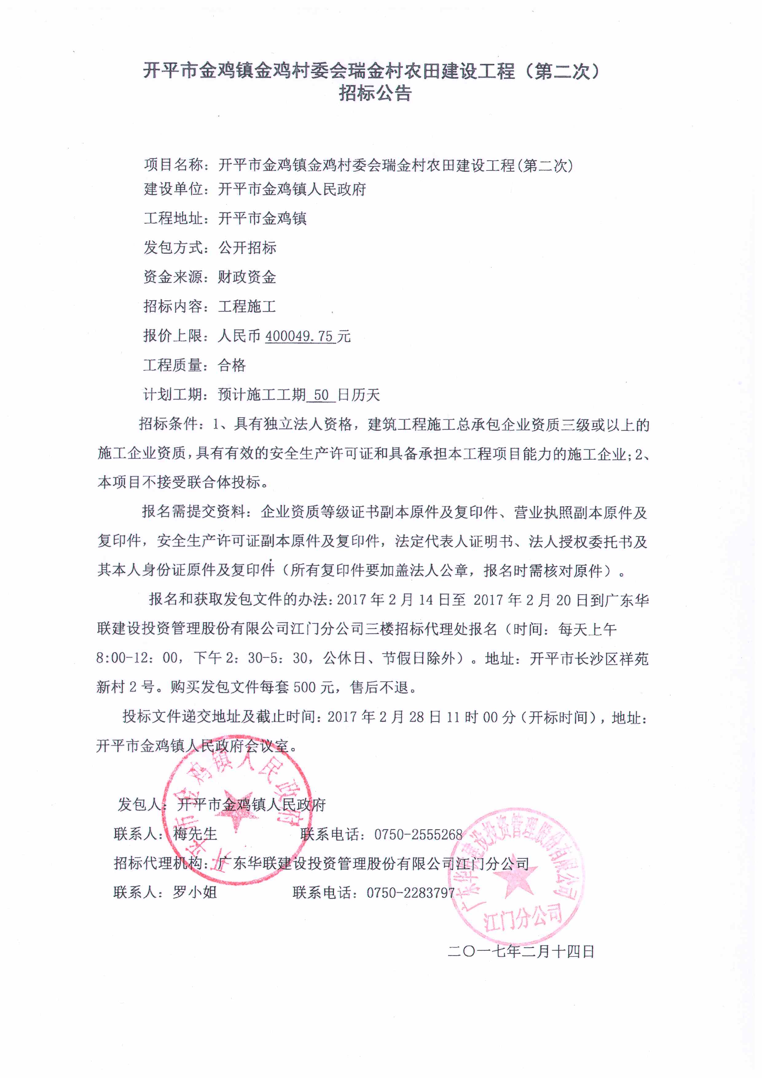 開平市金雞鎮(zhèn)金雞村委會瑞金村農田建設工程招標公告(第二次)