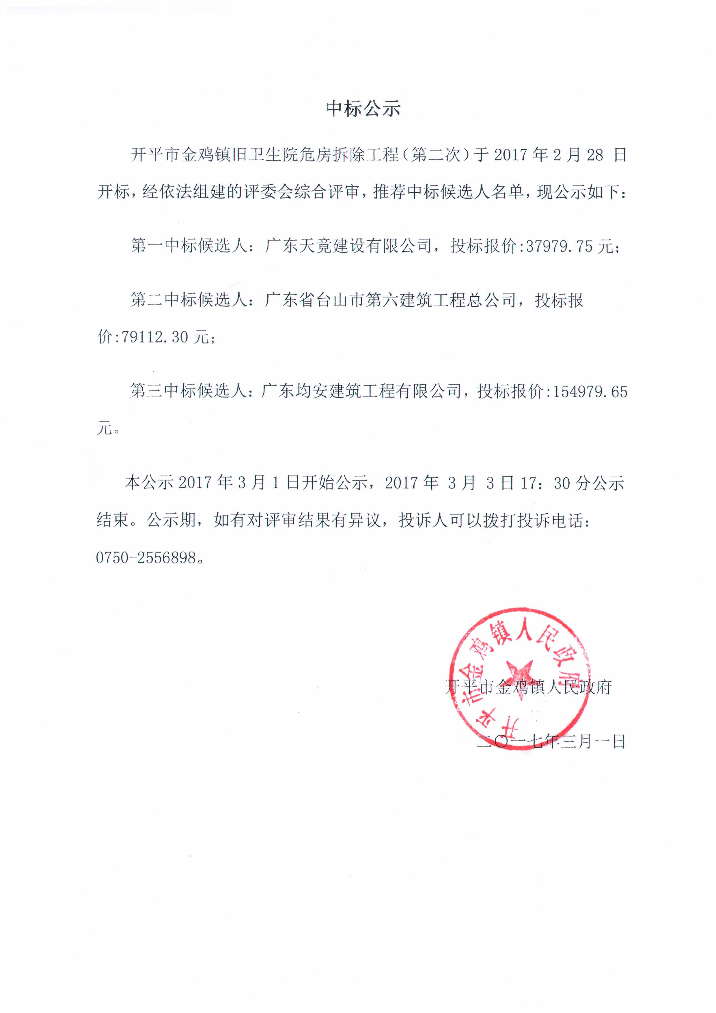 開平市金雞鎮舊衛生院危房拆除工程中標公示