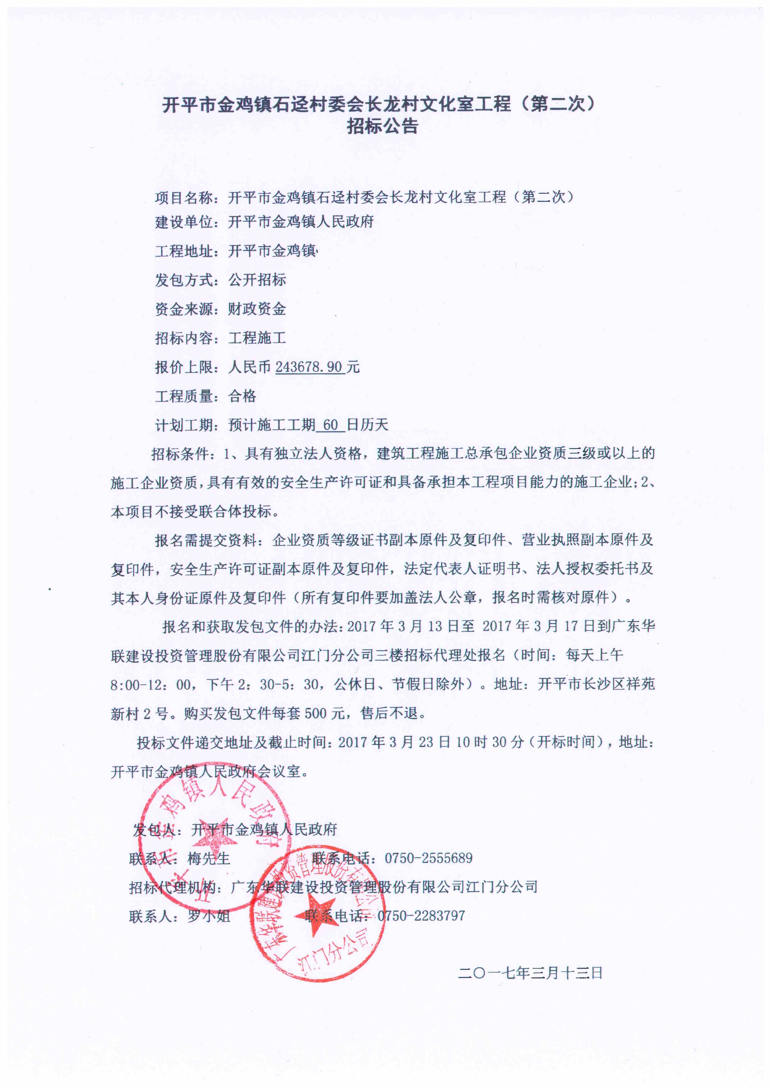 開平市金雞鎮石逕村委會長龍村文化室工程(第二次)
