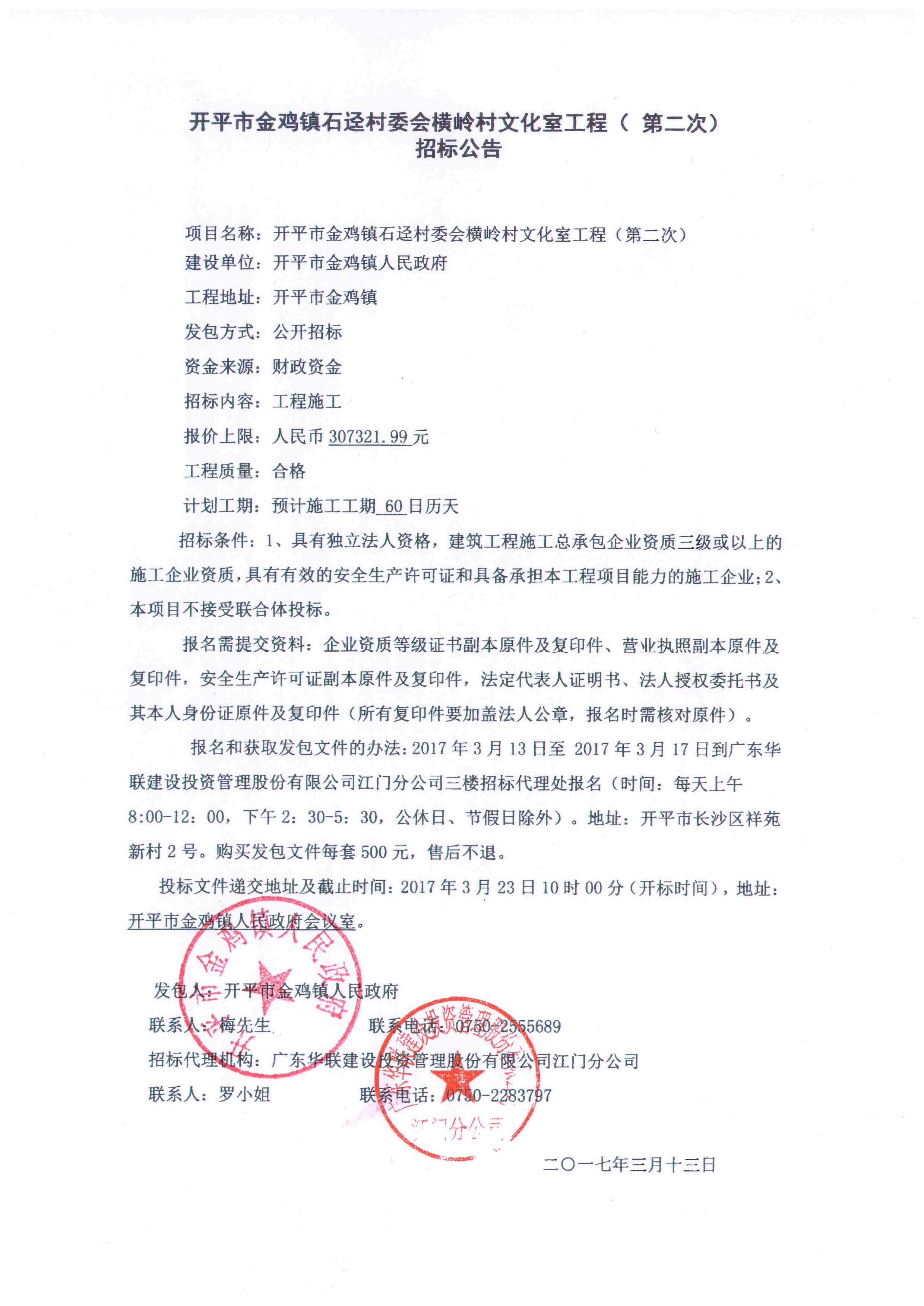 開平市金雞鎮石逕村委會橫嶺村文化室工程(第二次)