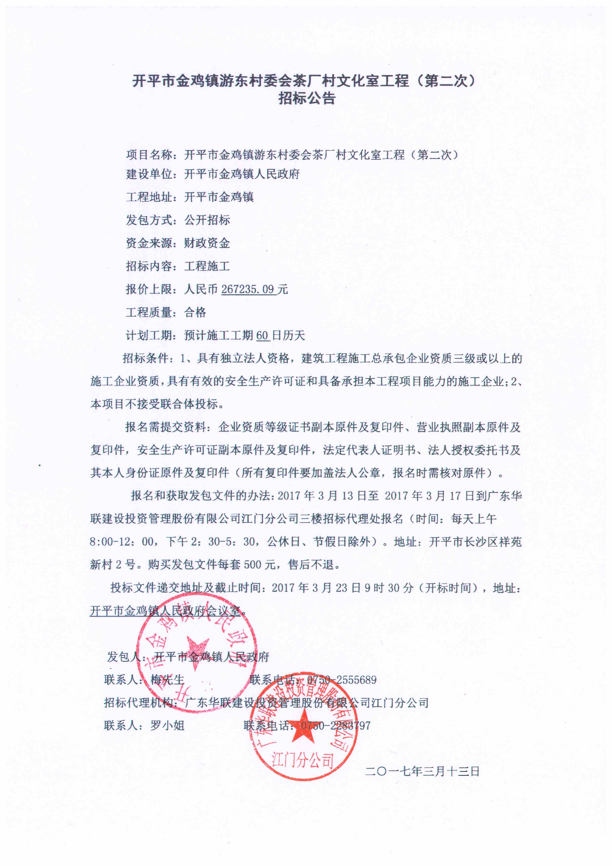 開平市金雞鎮游東村委會茶廠村文化室工程(第二次)