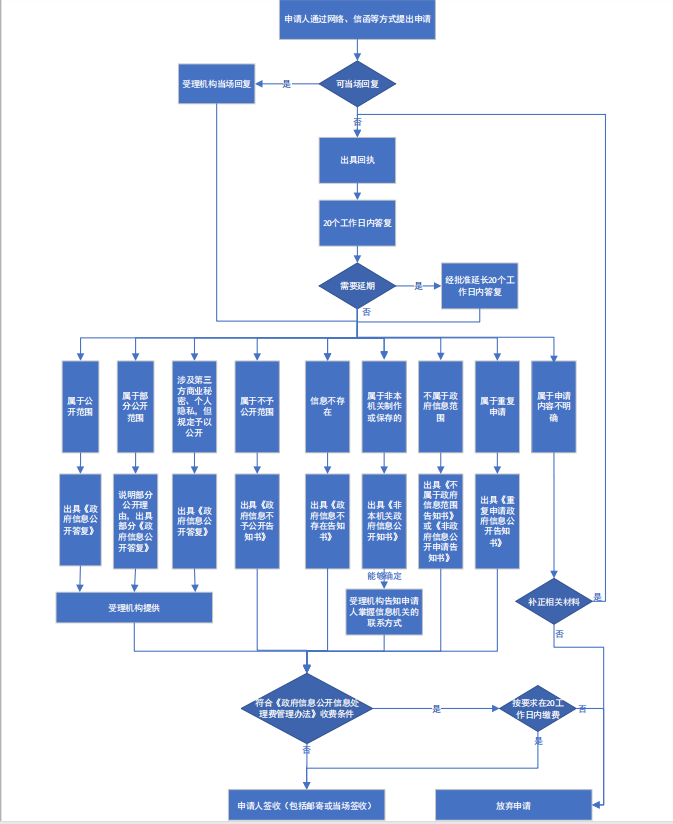 對于能夠當場答復(fù)的政府信息公開申請,將當場答復(fù);不能當場答復(fù)的,自收到申請之日起20個工作日內(nèi)予以答復(fù);確需延長答復(fù)期限的,經(jīng)政府信息公開工作機構(gòu)負責人同意,延長答復(fù)時間不超過20個工作日,并告知申請人。《條例》另有規(guī)定的,從其規(guī)定。本機關(guān)征求第三方和其他機關(guān)意見所需時間不計算在前款規(guī)定的期限內(nèi)。