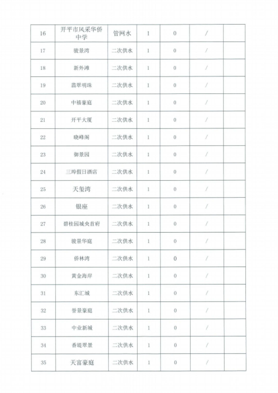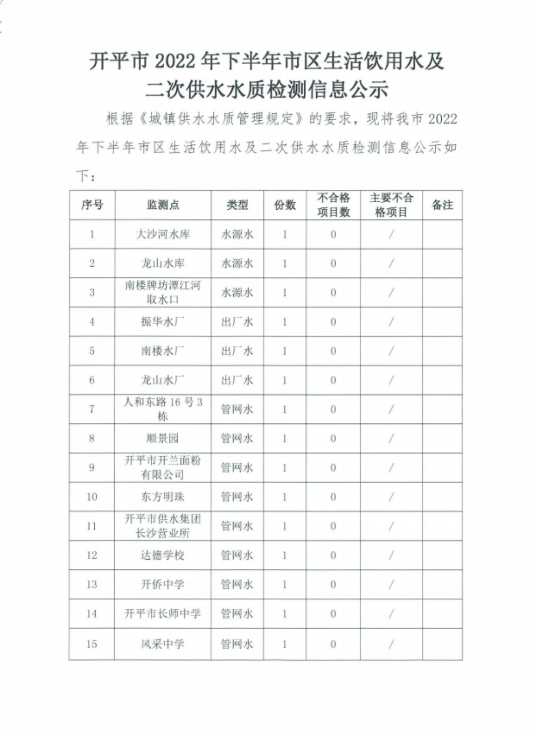 開平市2022年下半年市區生活飲用水及二次供水水質檢測信息公示