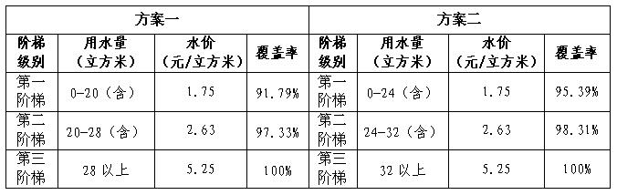 居民用水戶以戶為單位,每戶4人(含4人以下)為基數,第一級水價維持現行水價標準不變,即1.75元/立方米,第二、三級水價按照1:1.5:3的比例分別定為2.63元/立方米和5.25元/立方米,制定如下聽證方案: