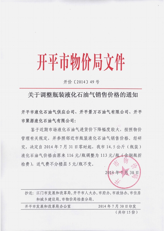 開價[2014]49號 關于調整瓶裝液化石油氣銷售價格的通知