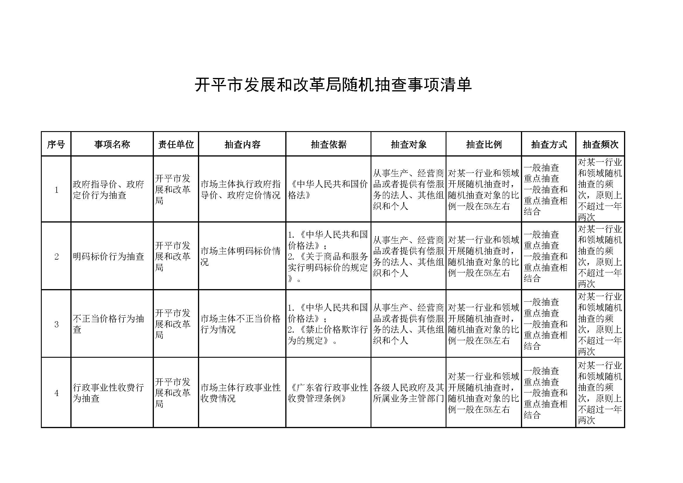 開平市發(fā)展和改革局隨機抽查事項清單