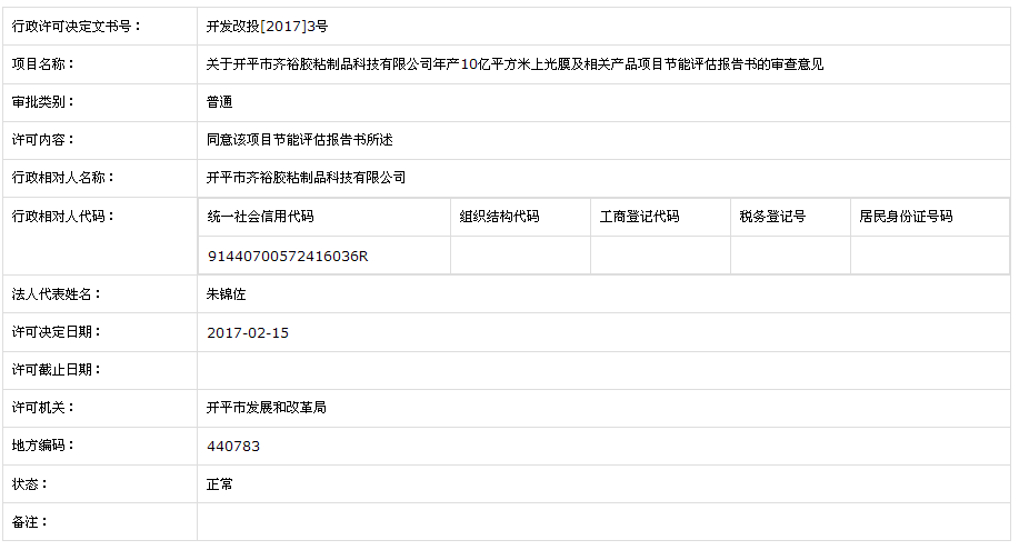 關于開平市齊裕膠粘制品科技有限公司年產10億平方米上光膜及相關產品項目節能評估報告書的審查意見