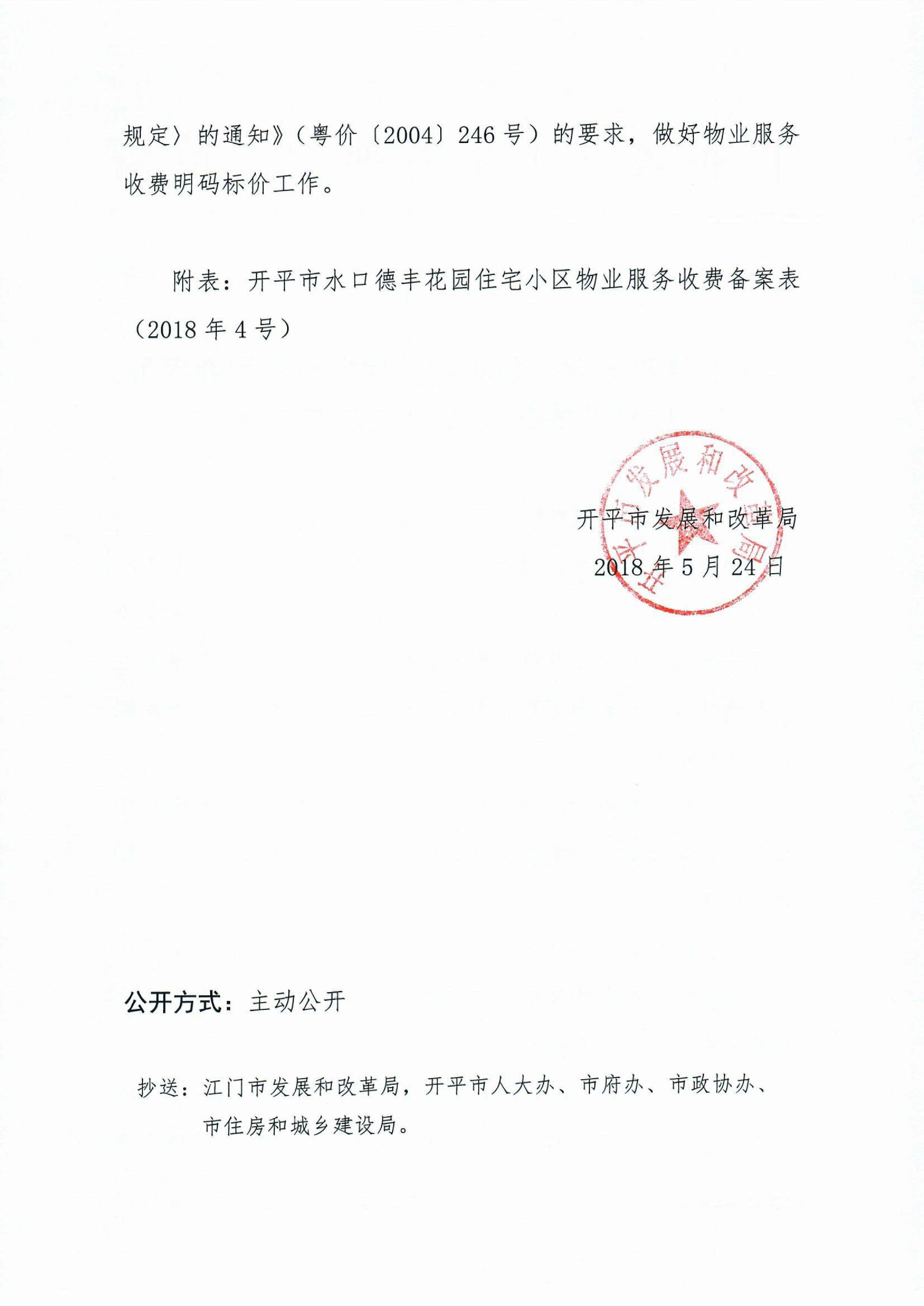 開發改價管函〔2018〕5號 關于對開平市水口德豐花園住宅小區物業服務、房屋裝飾裝修收費的備案復函
