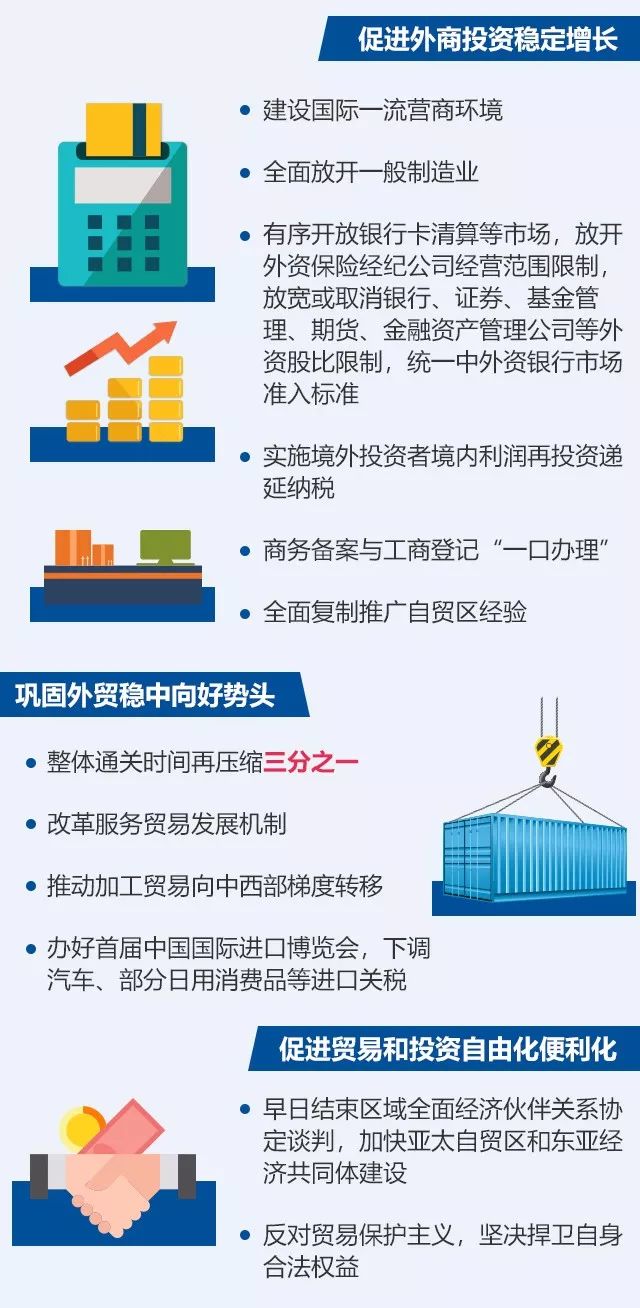 開放:放寬或取消銀行、證券、基金管理、期貨、金融資產管理公司等外資股比限制。探索建設自由貿易港。