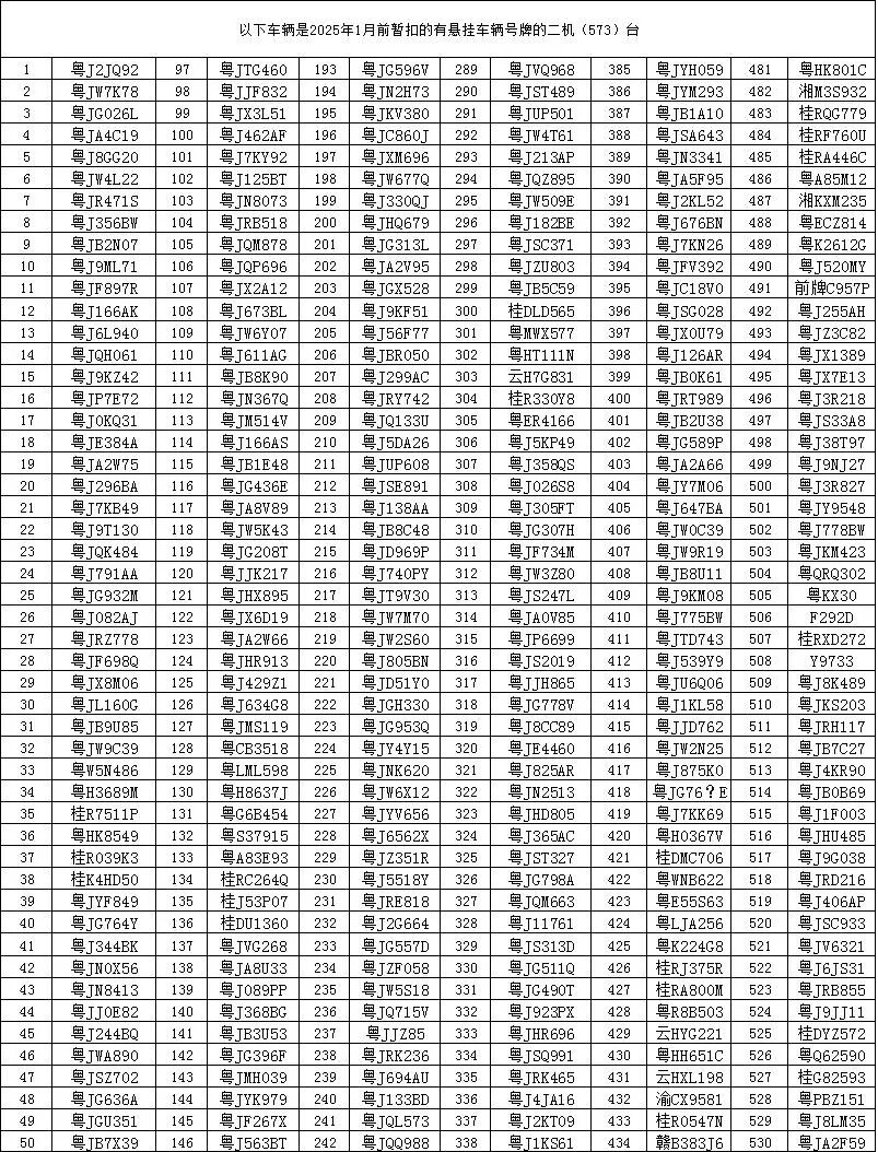 一、違法車輛在2025年1月前因涉及交通違法行為,已被公安機關交通管理部門依法扣留,其駕駛人、所有人和管理人均未按規定期限到公安機關交通管理部門接受處理。依據《中華人民共和國道路交通安全法》第一百一十二條、《中華人民共和國道路交通安全法實施條例》第一百零七條等相關法律法規的規定,現予以公告。自本公告發布之日起經過三個月,當事人仍不前來處理的,公安機關交通管理部門將對扣留的車輛依法處理。