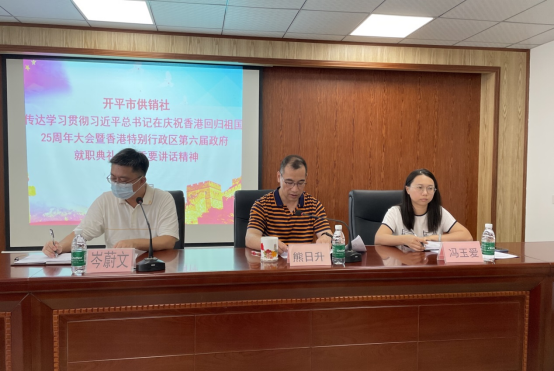 7月20日上午,開平市供銷社召開黨組(擴大)會議,傳達學習貫徹習近平總書記在慶祝香港回歸祖國25周年大會暨香港特別行政區第六屆政府就職典禮上的重要講話精神,以及省、江門、開平有關會議精神,研究部署我社貫徹落實意見。市社黨組書記、主任熊日升主持并講話,市社全體干部職工、下屬單位負責人參加了會議。 會議指出,習近平總書記的重要講話,高度評價25年來“一國兩制”實踐在香港取得舉世公認的成功,全面總結“一國兩制”在香港的豐富實踐給我們留下的寶貴經驗、深刻啟示,對香港特別行政區新一屆政府和社會各界人士提出4點希望,蘊含著對香港發展的深邃思考、體現著對香港同胞的深切關懷,為香港開創新局面、實現新飛躍指明了努力方向,注入了堅定信心和強大力量,對供銷工作具有重要指導意義。 會議強調,要迅速行動、精心組織、周密安排,做好宣傳學習,推動習近平總書記重要講話精神在我社落地生根、開花結果,切實把學習成果轉化為真抓實干的具體行動。一要提高政治站位,切實把思想和行動統一到總書記、黨中央的決策部署上來。深刻領會總書記重要講話精神,抓住粵港澳大灣區建設等重大歷史機遇,胸懷“國之大者”,堅定捍衛“兩個確立”、堅決做到“兩個維護”,扎實抓好疫情防控、供銷綜合改革、服務“三農”的各項工作,以優異成績迎接黨的二十大勝利召開。二要從嚴從緊,科學精準做好疫情防控工作。堅持“外防輸入、內防反彈”總策略和“動態清零”總方針,堅決防止麻痹思想、厭戰情緒、松勁心態,鞏固好來之不易的防控成果。按照我市疫情防控的工作部署,強化疫情防控常態化管理工作,加強對辦公場所防疫管理,守好自己的門、管好自己的人,不斷提升科學防控、精準防控水平。加大宣傳力度,營造防控良好社會氛圍。強化全局意識、展示供銷責任擔當,全力以赴保障人民群眾生命安全和身體健康。三要搶抓機遇,深化與港澳地區合作交流。緊緊抓住灣區發展這一機遇,圍繞開平農產品資源及農業產業發展優勢,積極爭取各方力量支持,加快推進與省供銷集團公司共建粵港澳大灣區(江門開平)優質農產品供應及出口基地建設,為我市乃至珠江西岸的農產品輸出提供了強有力的平臺支撐。四要毫不松懈,嚴密防范化解各類風險隱患。始終以“時時放心不下”的責任感,抓實抓細安全生產各項工作,全力確保人民群眾生命財產安全。扎實做好供銷系統意識形態領域各項工作,堅決守好意識形態陣地,嚴格落實意識形態工作責任制,筑牢意識形態安全“護城河”和“防火墻”。