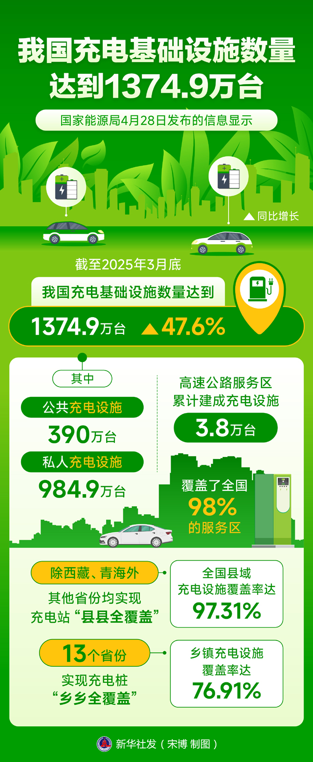 國家能源局4月28日發布的信息顯示,截至2025年3月底,我國充電基礎設施數量達到1374.9萬臺,同比增長47.6%。新華社發 宋博 制圖