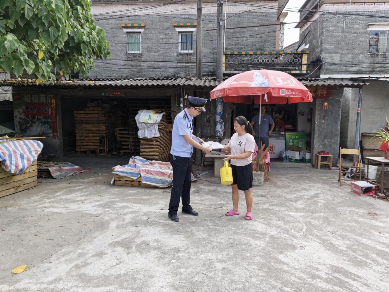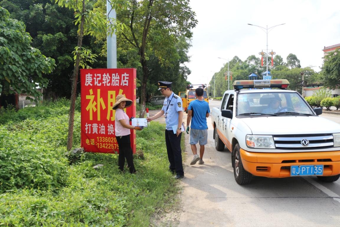 (交通運輸局工作人員向商家宣傳路政文件單張)