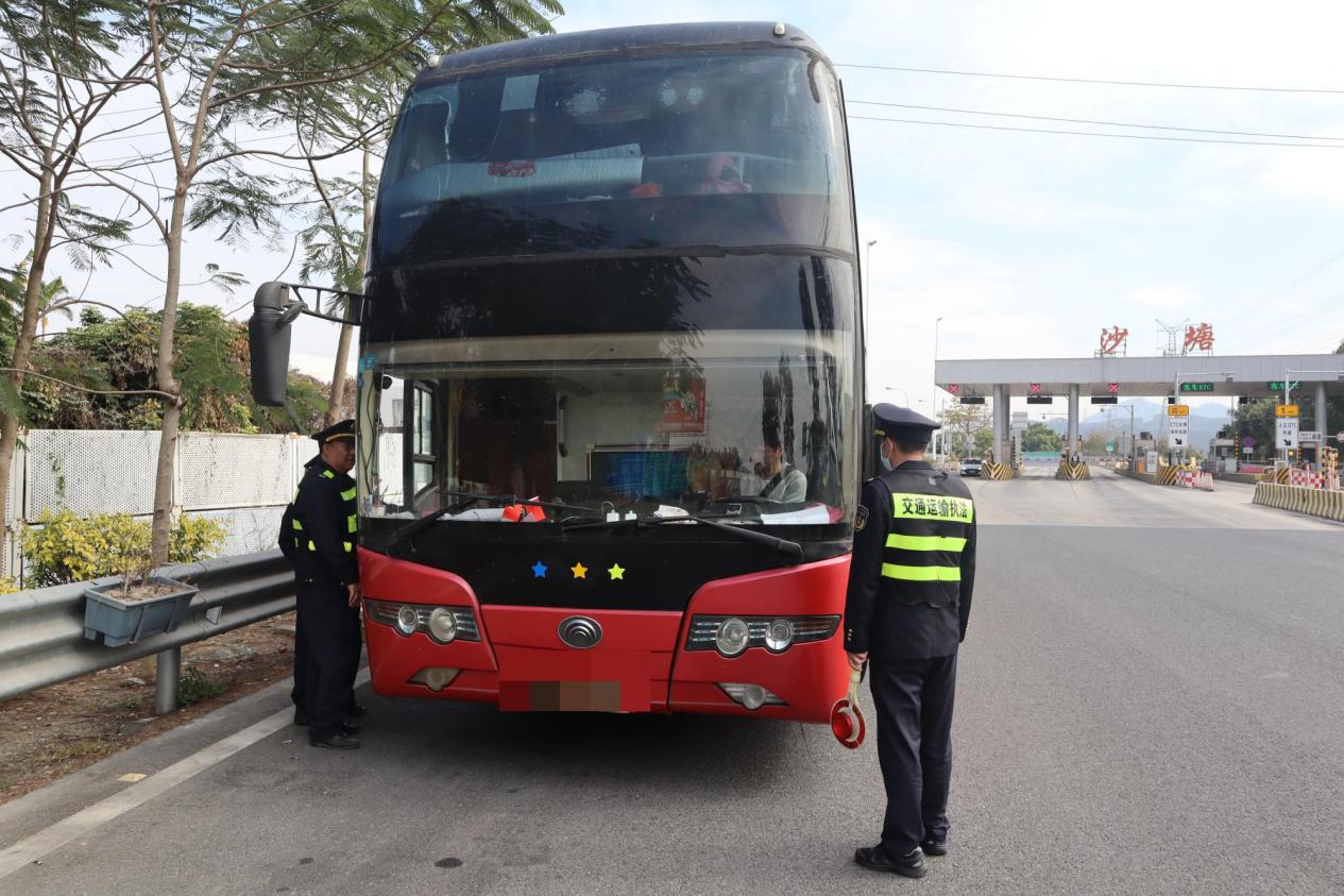隨后,執法人員對經過沙塘出口路段的另一輛桂E號牌的大型普通客車進行檢查,發現該車輛共搭載22名乘客,為省際客運包車,但該車輛經營者現場提供的包車合同顯示該車次行程途經地、目的地均不包含江門地區,與實際的客運經營情況不相符。經過執法人員的普法教育,該客運包車司機積極配合執法人員完成調查取證工作。目前有關案件正在進一步處理中。