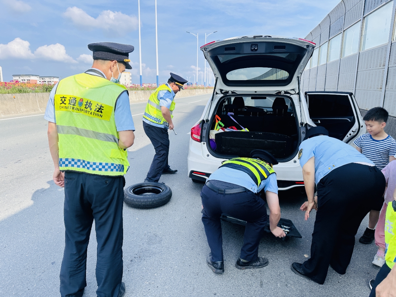 高效處置險情,消除道路風險。5月4日下午,交通運輸執法人員在環城公路西環段高架橋巡查時,發現一輛小轎車因左后輪爆胎停靠在右側路面,車主未按規定擺放三角警示牌,存在嚴重安全隱患。執法人員迅速設置警示標志,協助更換備用輪胎,并護送車輛至合規汽修廠檢修,及時消除道路通行風險。