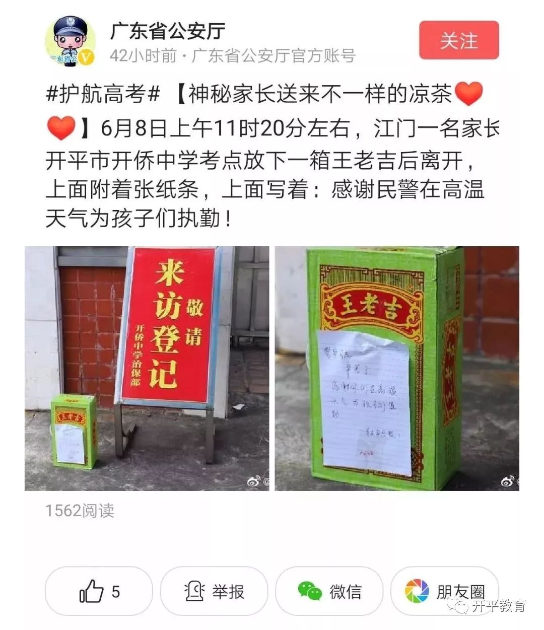“感動高考”。6月8日,開僑中學考點上演感動一幕:一家長送來一箱涼茶,感謝民警在高溫天氣為孩子們執勤。該事件得到廣東省公安廳充分肯定。