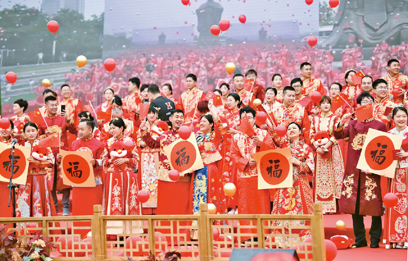 2021年6月27日,在“同心同慶 情滿少海”山東省青島市新時代文明實踐集體婚禮膠州專場,137對新人齊聚一堂,以溫馨浪漫而又簡約簡單的方式步入新時代文明實踐婚姻的殿堂。圖為新人們在集體婚禮上手持書法家送上的“福”字。 人民圖片 王昭脈/攝
