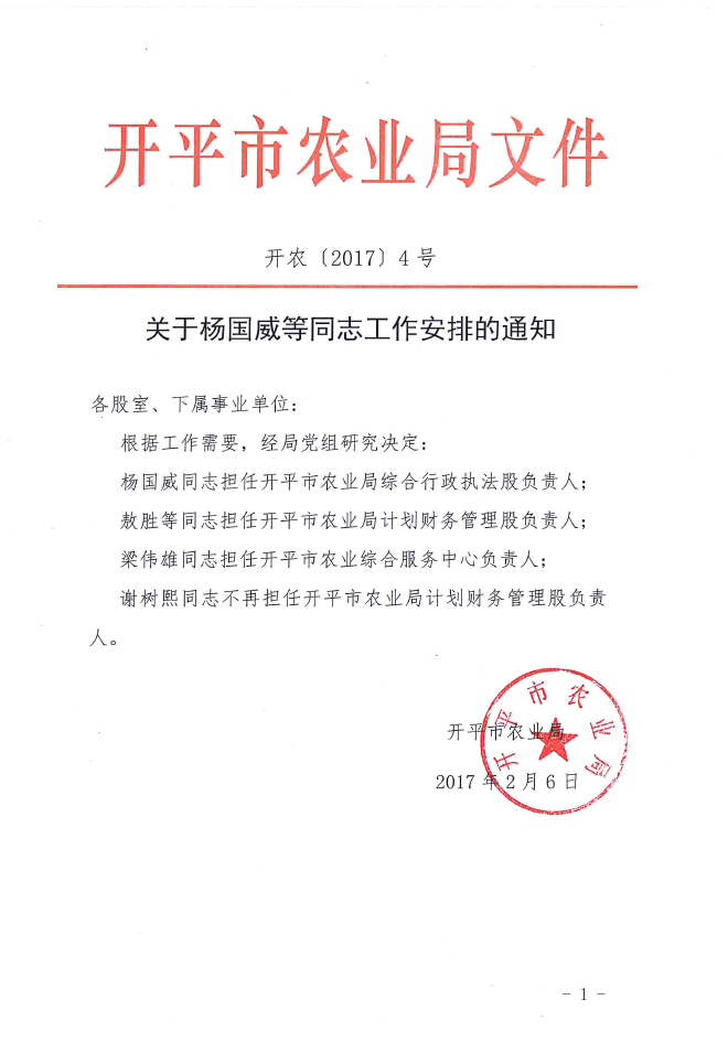 關于楊國威等同志工作安排的通知(開農【2017】4號)