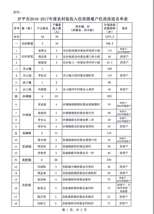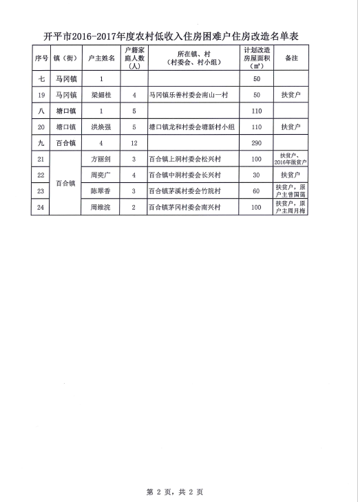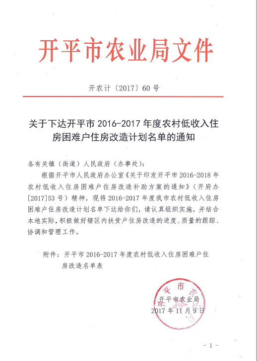 關于下達開平市2016-2017年度農村低收入住房困難戶住房改造計劃名單的通知