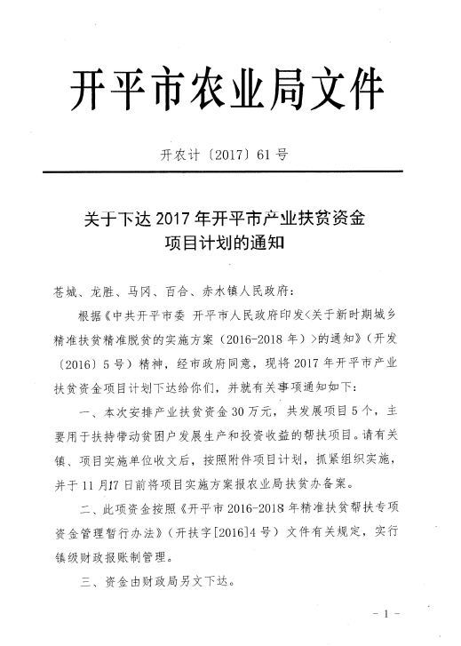 關于下達2017年開平市產業扶貧資金項目計劃的通知