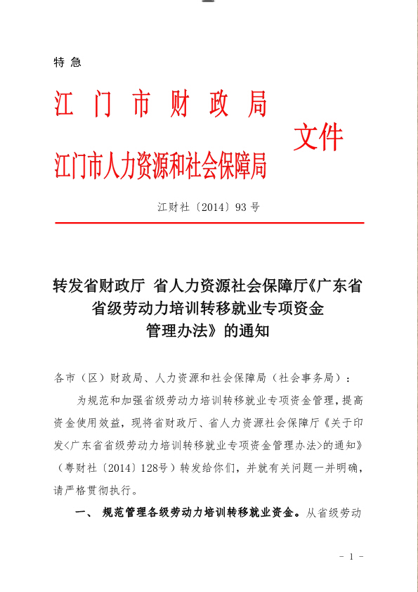 轉發《廣東省省級勞動力培訓轉移就業專項資金管理辦法》的通知