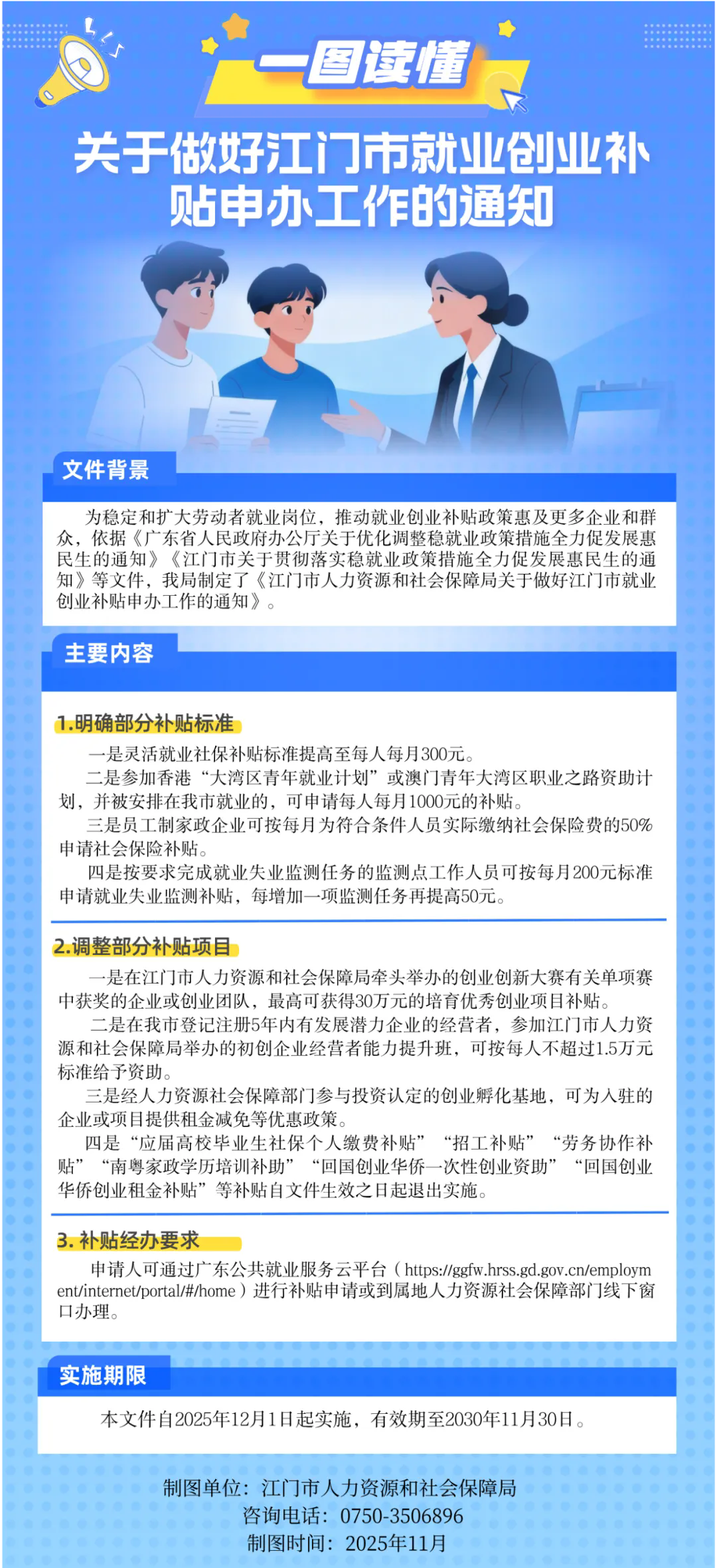黨中央、國務院高度重視就業工作,2024年,習近平總書記在中共中央政治局第十四次集體學習時,圍繞促進高質量充分就業發表重要講話。2025年政府工作報告提出“要完善就業優先政策,加大各類資金資源統籌支持力度,促進充分就業、提高就業質量。”為貫徹落實黨中央、國務院關于促進高質量充分就業的工作部署,省、市接連出臺了《廣東省人民政府辦公廳關于優化調整穩就業政策措施全力促發展惠民生的通知》《江門市關于貫徹落實穩就業政策措施全力促發展惠民生的通知》,對部分就業創業補貼政策進行了優化調整,為做好新舊政策銜接工作,確保補貼政策及時精準落地實施,市人力資源社會保障局制定了《江門市人力資源和社會保障局關于做好江門市就業創業補貼申辦工作的通知》(以下簡稱《通知》)。