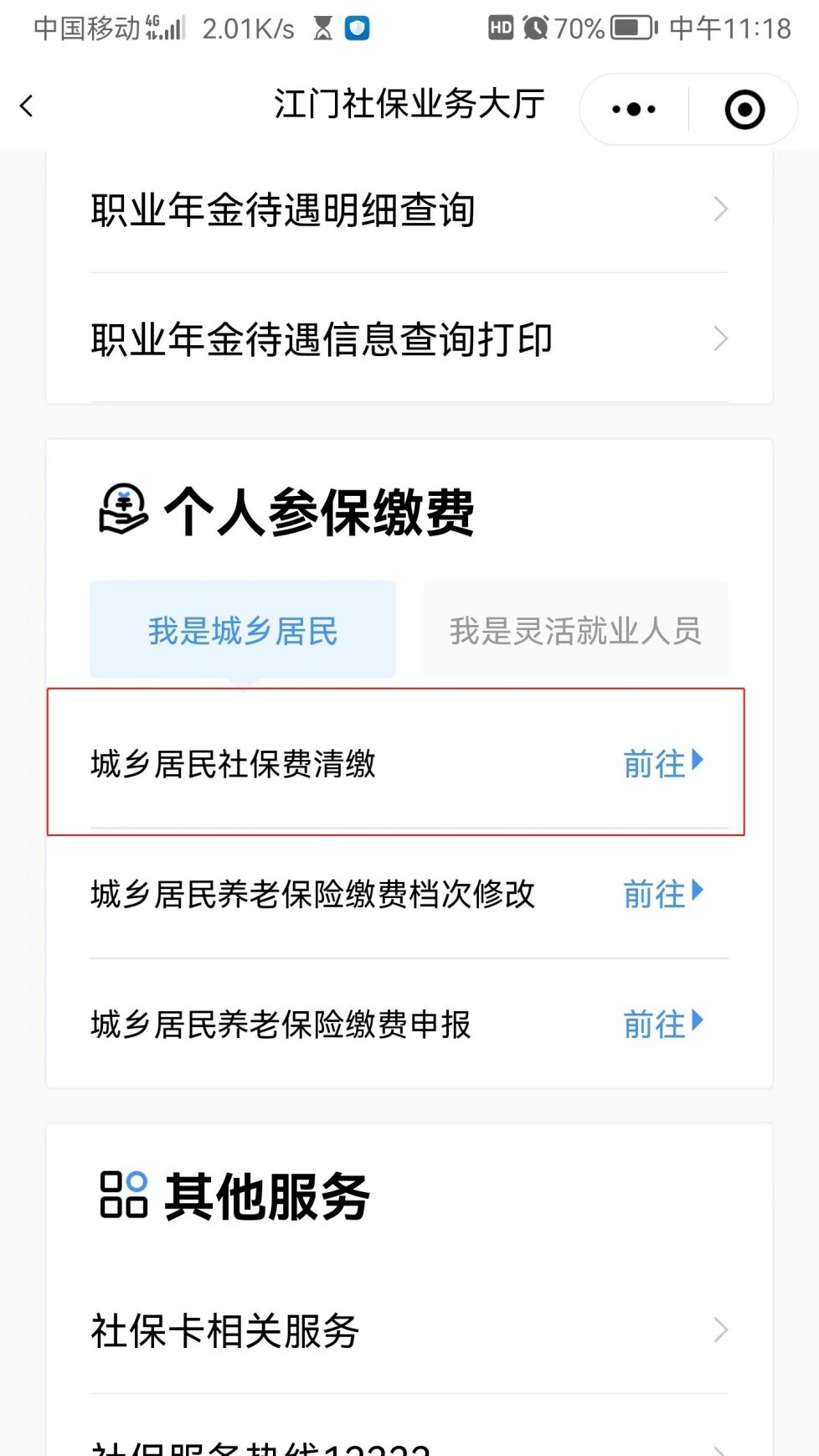 下拉頁面至“個人參保繳費”項,選擇“城鄉居民社保費清繳”
