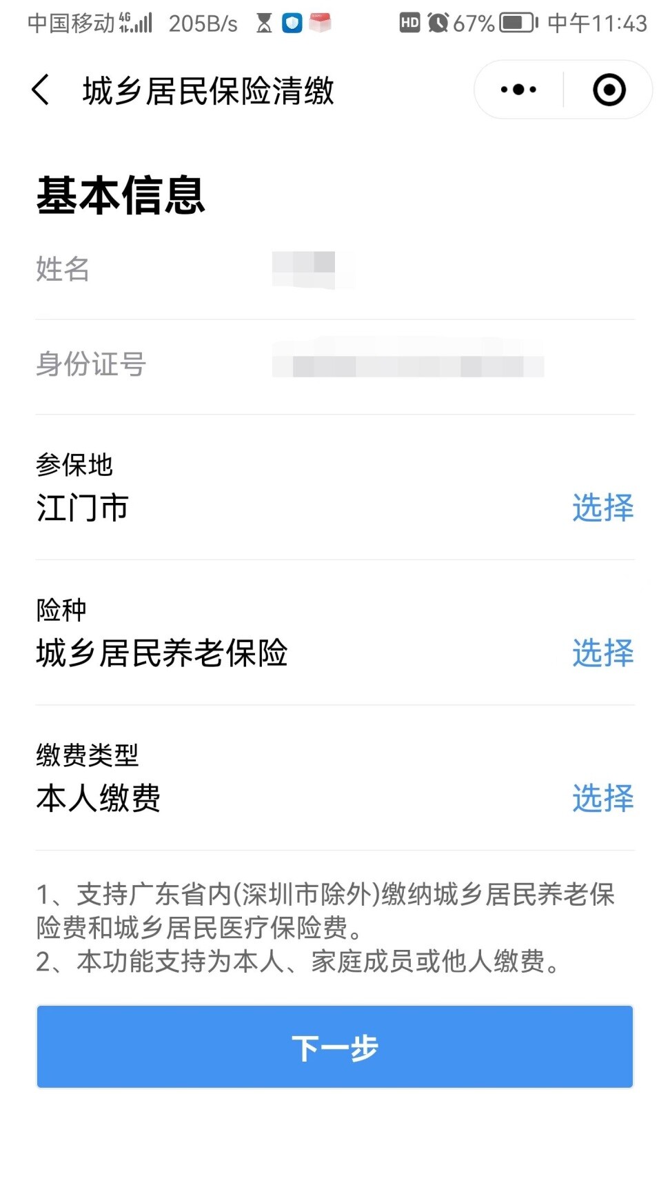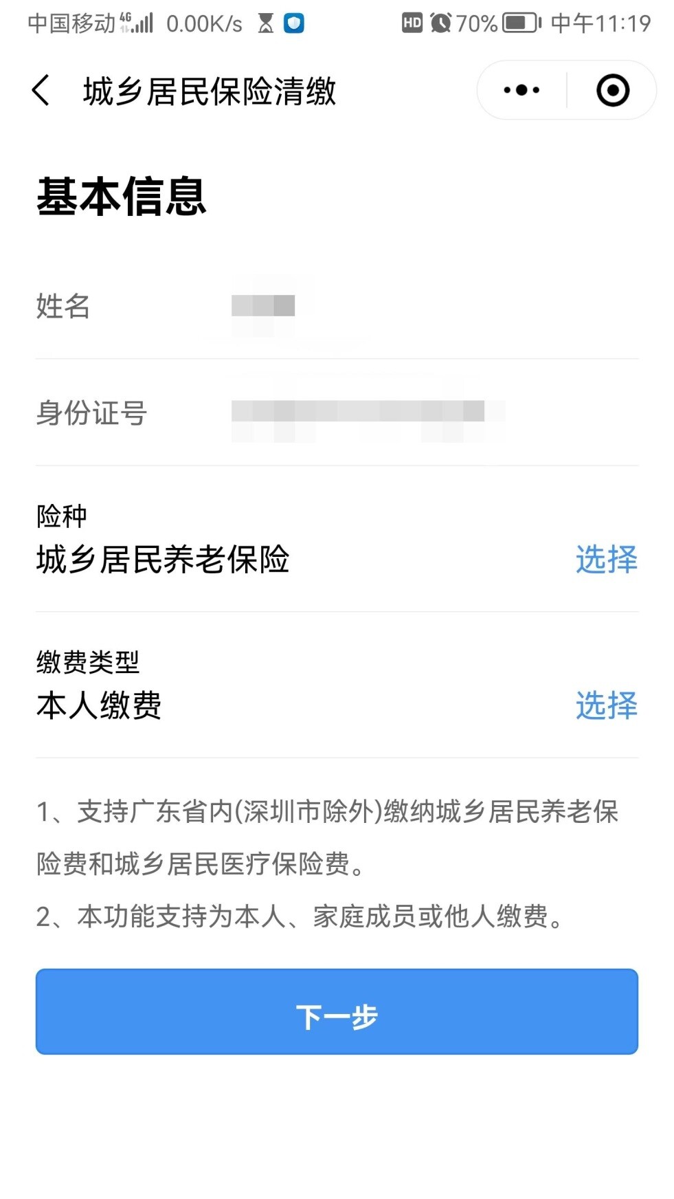 選擇好對應參保地、險種、繳費類型,點擊下一步完成繳費。