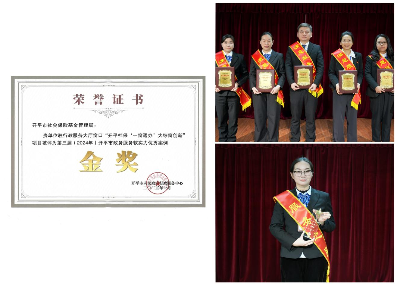 2024年,開平市社保局始終堅持以人民為中心的發展思想,將群眾需求作為經辦工作的出發點和落腳點。在已有的綜合業務“一窗通辦”基礎上,再度積極探索創新,與開平市人民政府行政服務中心、國家稅務總局開平市稅務局緊密合作,整合各方資源,推進開平社保“一窗通辦”大綜窗創新項目。憑借不懈努力,該項目一舉榮獲第五屆全國政務服務軟實力“模式創新開拓者獎”,同時在第三屆(2024年)開平市政務服務軟實力優秀案例評選中,斬獲金獎。