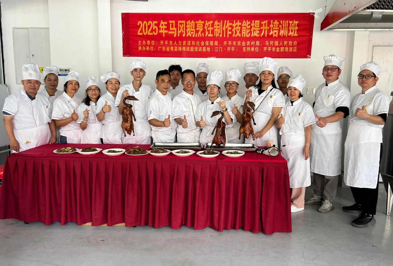 2025年5月,開(kāi)平市人社局聯(lián)合開(kāi)平市農(nóng)業(yè)農(nóng)村局、馬岡鎮(zhèn)人民政府縱深啟動(dòng)馬岡鵝烹飪技藝專(zhuān)項(xiàng)培訓(xùn),40余名學(xué)員在名廚師傅引領(lǐng)下精研脆皮水秘制工藝與“一鵝多味”味型創(chuàng)新,深入理解并融合經(jīng)典與當(dāng)代的味覺(jué)精髓。2021至今,開(kāi)平市人社局以粵菜技藝傳承為軸心,依托技能大師工作室及企業(yè)實(shí)訓(xùn)基地,整合社會(huì)資源創(chuàng)新培養(yǎng)模式,累計(jì)培養(yǎng)持證粵菜師傅超1000人,不僅為本地餐飲業(yè)持續(xù)輸送專(zhuān)業(yè)人才,有效促進(jìn)就業(yè),更向港澳地區(qū)輸送優(yōu)質(zhì)粵菜師傅,構(gòu)建并完善“本土深耕、灣區(qū)聯(lián)動(dòng)”的就業(yè)新生態(tài)。