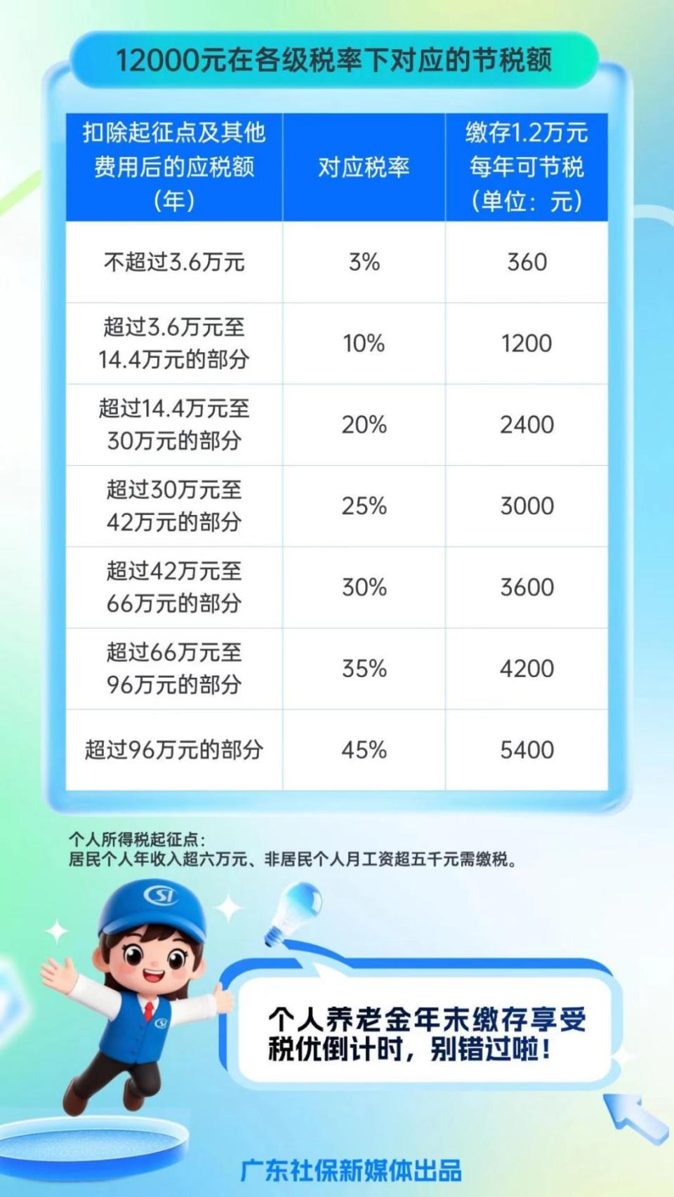 除了“靈活領取”,個人養老金還能幫您省個稅!在年度個稅匯算時,您繳納的個人養老金金額(每年最高12000元)可從應納稅所得額中扣除,減少您的個稅負擔。具體節稅額可參考下圖: