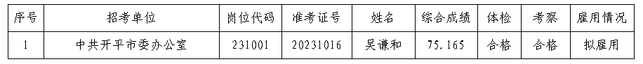 根據(jù)《開平市政府雇員管理試行辦法》(開府辦〔2012〕15號(hào))和《關(guān)于<開平市政府雇員管理試行辦法>的實(shí)施意見》(開人社〔2013〕96號(hào))規(guī)定,2023年10月開平市市直機(jī)關(guān)單位公開招考政府雇員考試中,經(jīng)考試、體檢和考察等程序,吳謙和同志考試成績的名次、體檢及考察結(jié)果均符合雇用條件,擬同意雇用,現(xiàn)予以公示。