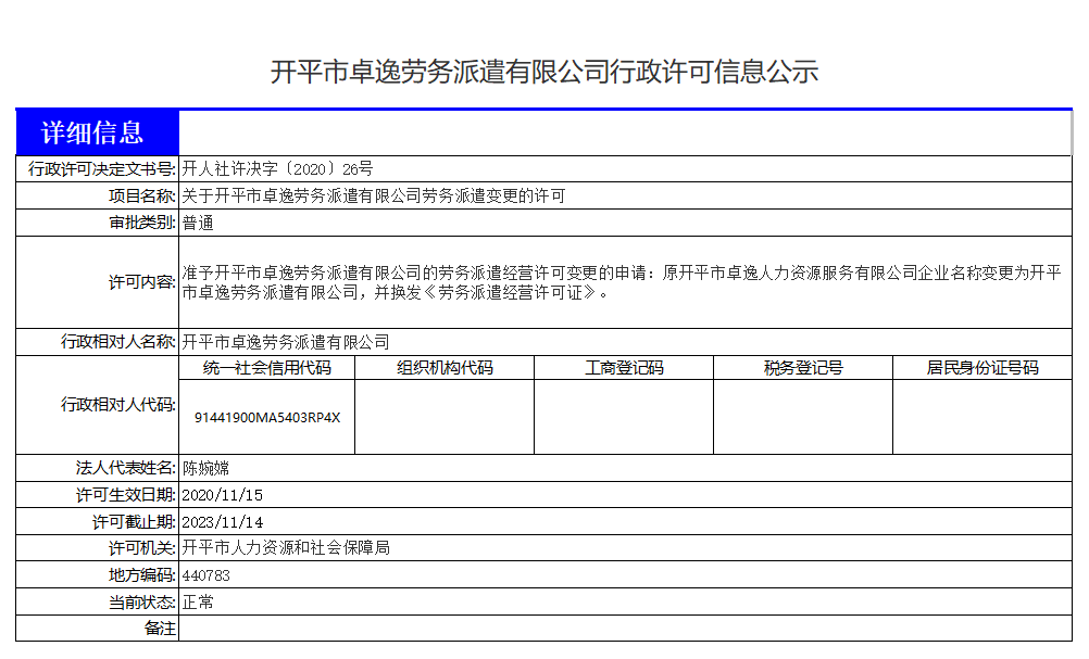 開平市卓逸勞務派遣有限公司行政許可信息公示