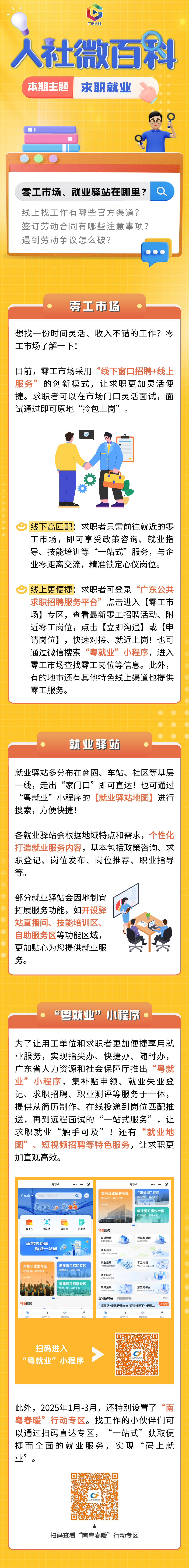 想打零工,但沒渠道?想找工作,又擔心路費太高?本期人社微百科化身“求職導航”,家門口就業服務圈帶你直通節后求職招聘“友好局”,讓小伙伴們原地“搵工”上崗,在零工市場、就業驛站、“粵就業”小程序開啟“家門口”“指尖上”的高效就業之旅。