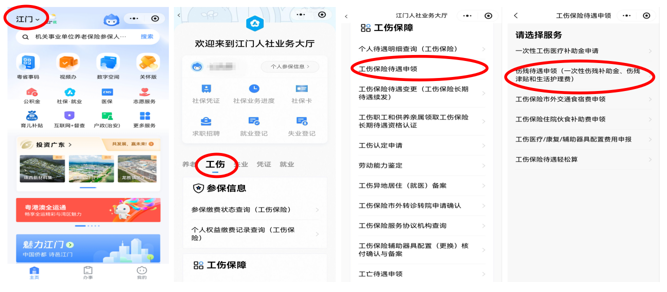 打開手機微信,搜索“粵省事”小程序,登錄后選擇辦事城市為【江門】,點擊【社保.就業】進入社保業務大廳,選擇【工傷保險待遇申領】-【傷殘待遇申領】,再按指引填寫申領信息和上傳資料即可進行線上申請。
